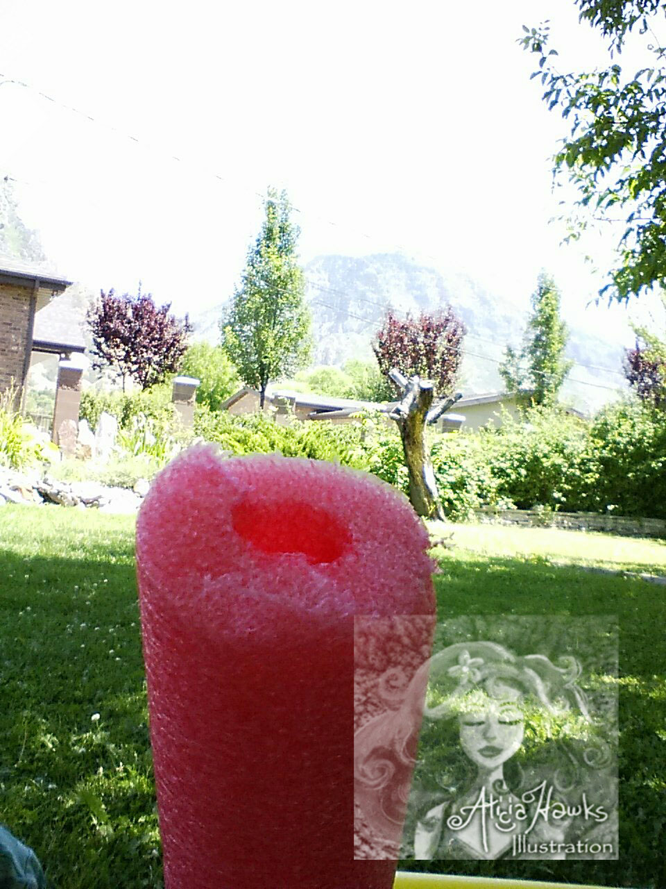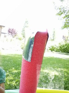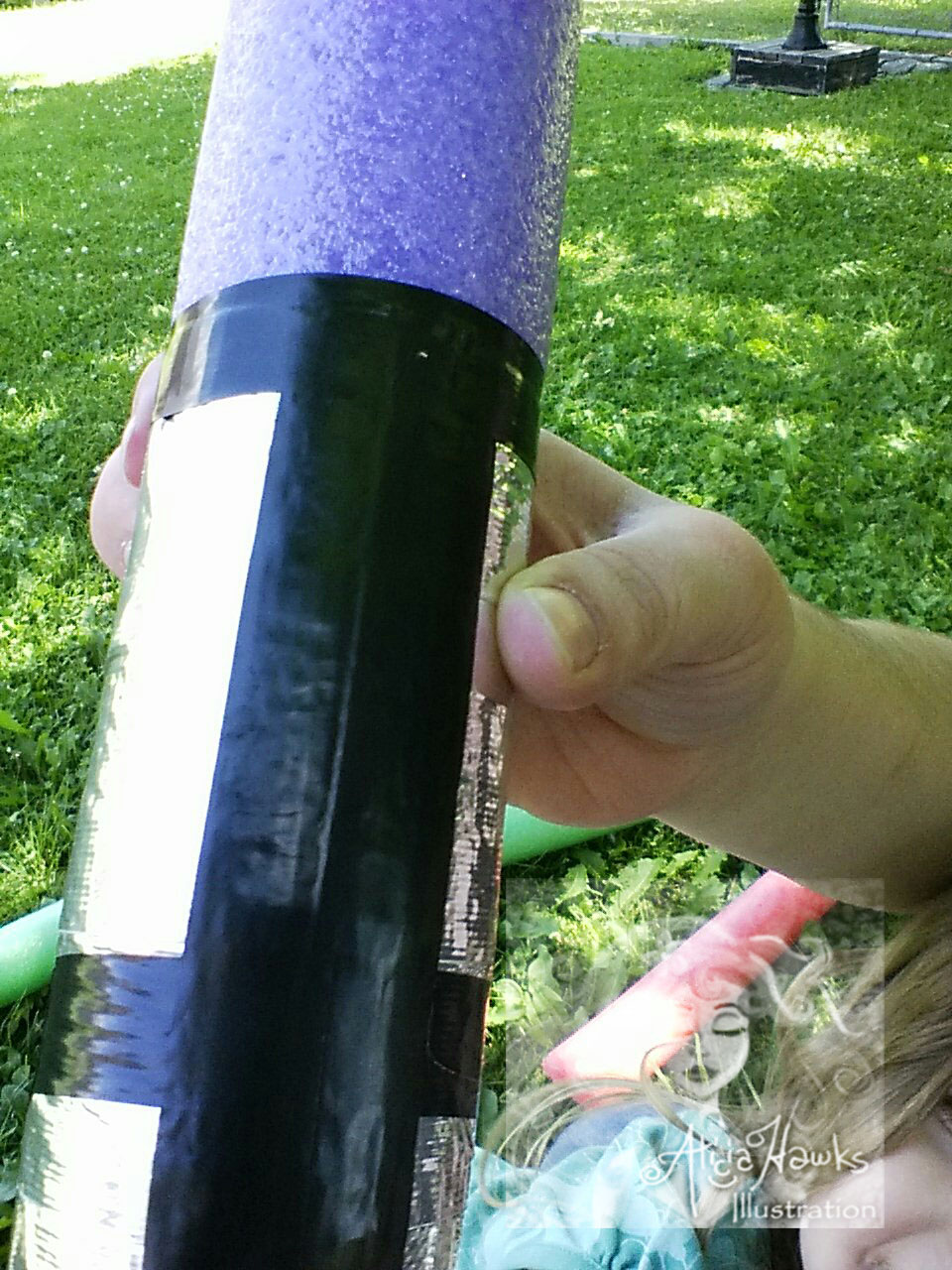 The next thing we did was make an X with the duct tape on the bottom of the noodle; which fixed the rough cut.
