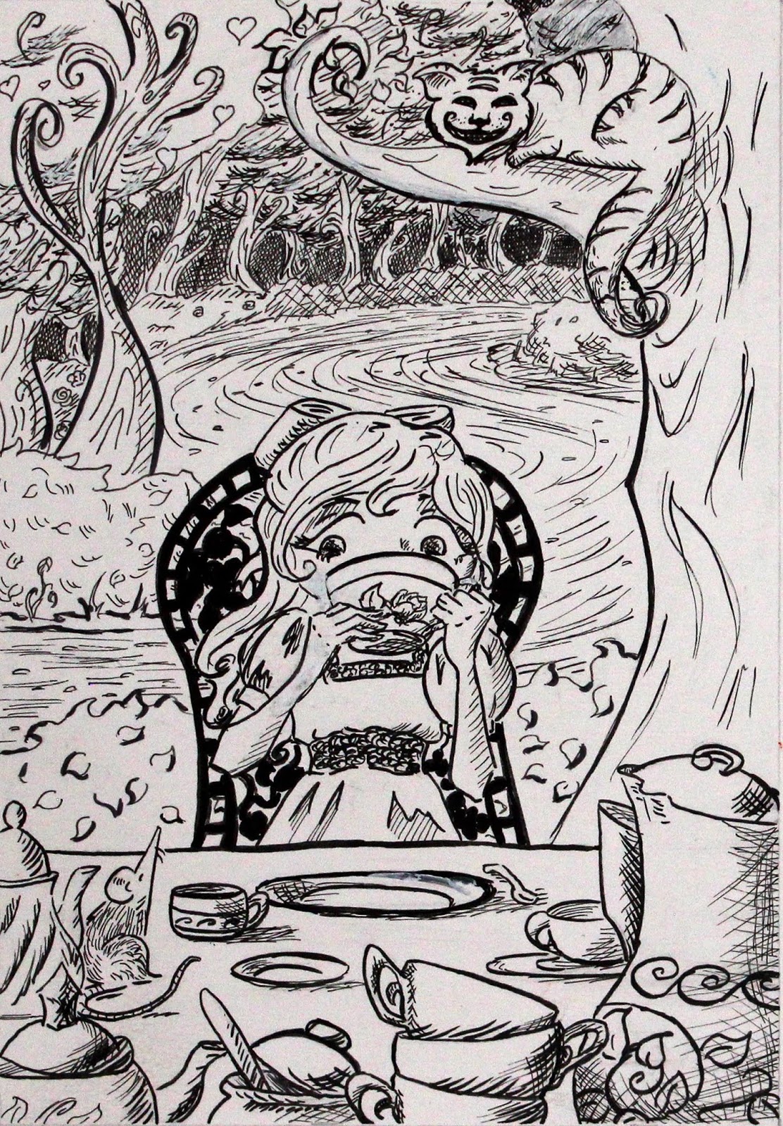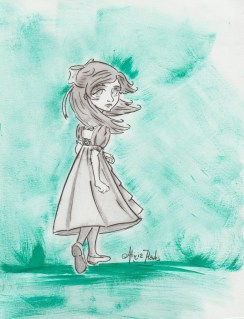 I love Lewis Carol’s Alice in Wonderland, a major theme in that book is of yearning; so many of the characters wish for things they cannot get while at the same time they do very little to get the things the yearn for. Alice is the only one who really moves through the story- and the things she yearns for at first are conflicted; she wants to explore and discover- but she also very much wants to go home through much of it. This was a drawing I did while figuring out the character design. I also had an art subscription box at the time and used it for the monthly challenge- you use only the supplies in the box and create some sort of art with it.