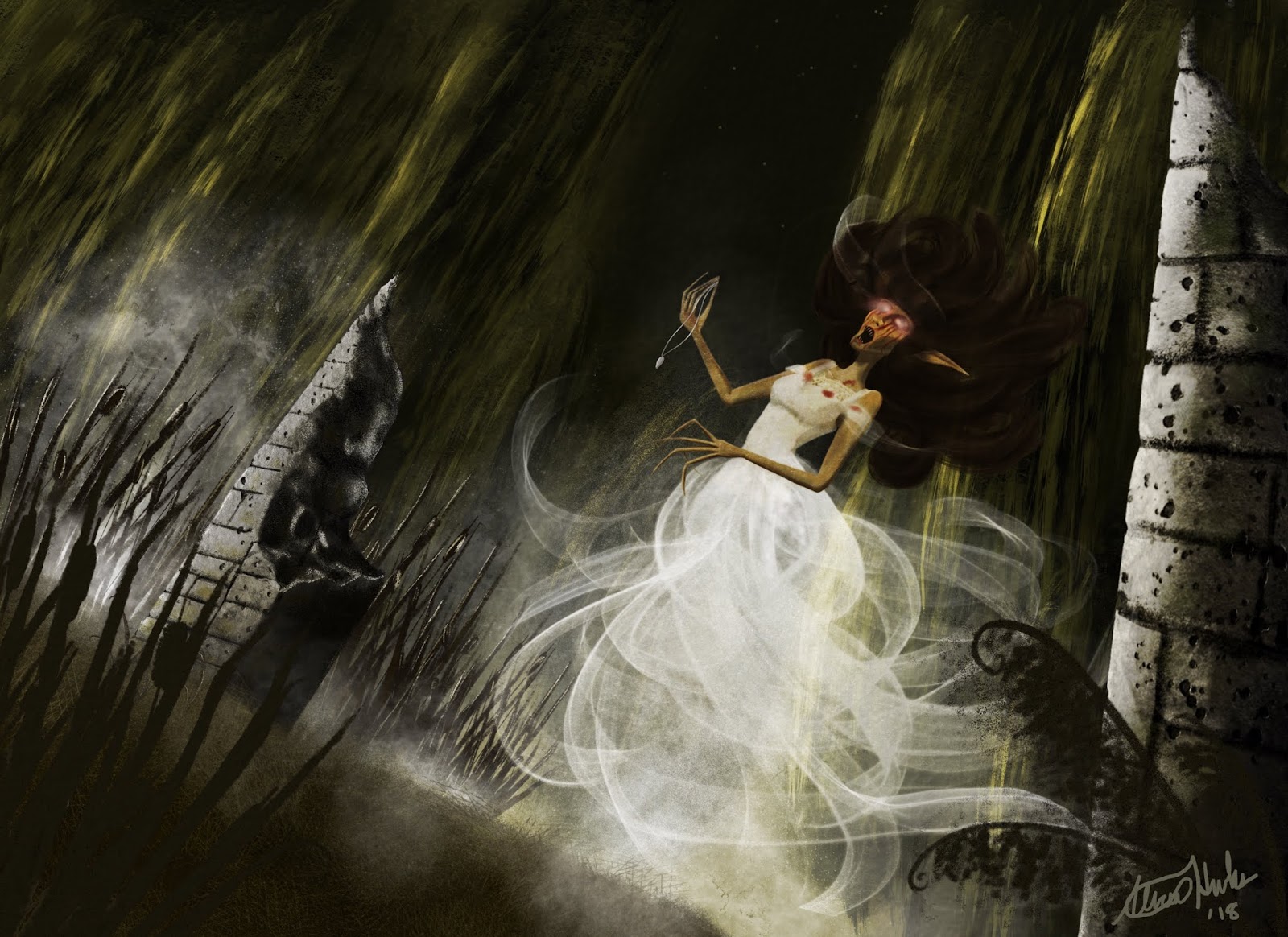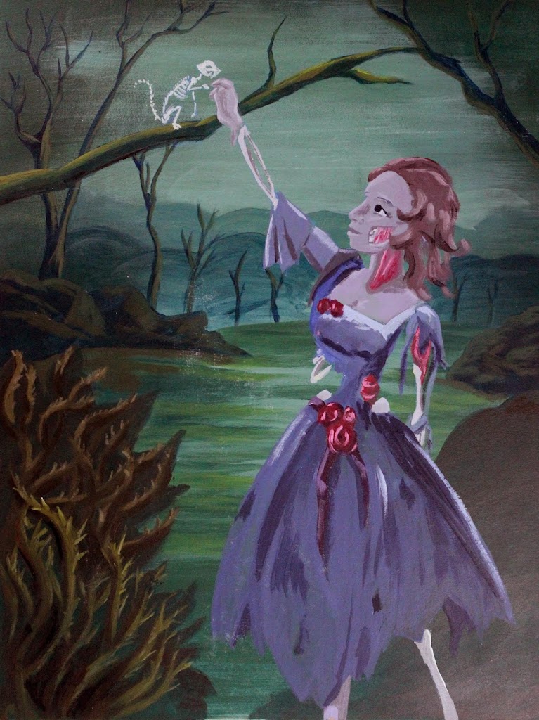 This is one of the few images that I painted in school that I’m actually proud of. It also has a bit of a story, because it is part of a world I’ve been writing about since I was 12. This is the Banshee of Sha’Dren, it is an extinct elven kingdom. The Banshee was once the queen of a thriving kingdom, the day of her marriage to a prince of a neighboring kingdom she and her people were betrayed. Dragon riders flew in from the south, and decimated her people. She died, but her anguish and agony lived on- as her kingdom crumbled and was reclaimed by the wild her essence moved among the ruins, hunting for those that betrayed.