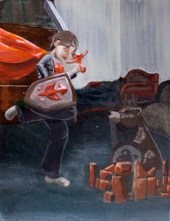 This painting was done about… 4 years ago I want to say?? It was when I was very very new to acrylic painting, like most of my older work done for school it doesn’t feel done- but I like the idea of it. This was my son when he was about 5, he has always had a great imagination. So here is my little Valient Knight.