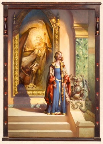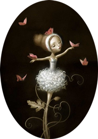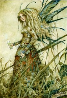 So back to Larry- the way he uses light is pretty astounding- for instance in the fairy below you are attracted to her face because it is bordered by darker values of yellow. None of the colors are really all that dark- BUT he paints in light in such a way that we can see what he wants us to see and we aren’t lost in a bunch of pretty colors.